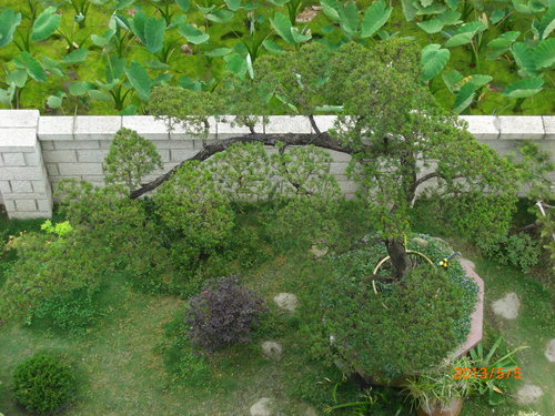 上週疏完葉整個樹身乾淨了起來,真柏只要光線無法照射之處就容易有白粉病的情況若能加以整理就可以預防,且根本不必噴藥...疏葉後從上面照下來整棵有點偽裝的感覺.