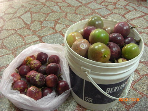這禮拜收成了一桶多的百香果,準備來喝個百香果汁了有點微紅就先採下來,不然隔一個禮拜沒看就又掉滿地爛掉了.